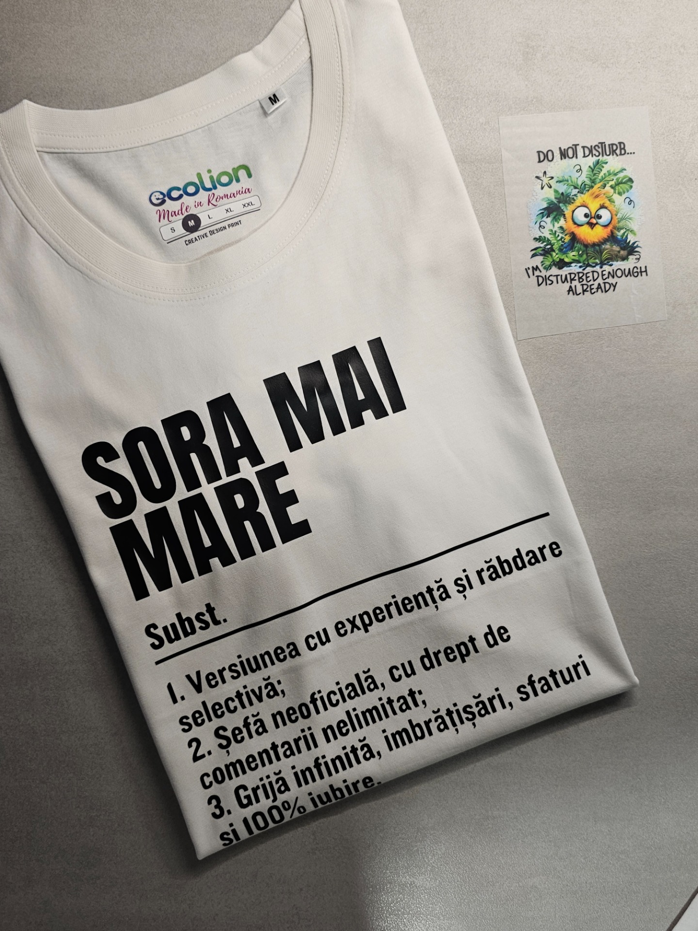 Tricou alb cu mesaj amuzant „Do Not Disturb” și un personaj adorabil – ideal pentru zilele când ai chef doar de tine. Confort garantat, stil jucăuș!